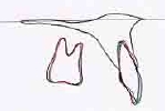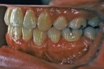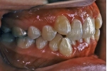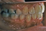 しかし、出題基準にも書いてあるように、このケースは欧米の白人によく見られるケースで、東洋人にはきわめて稀である。そこで類似ケースとして過蓋咬合(かがいこうごう)のケースを代替えとして認めるという配慮をしている。過蓋咬合とは非常に強く深く咬んでいる状態を言う。Overbiteとは前歯の垂直的な重なり具合を示す数値で、5mm以上だと上の前歯が下の前歯をほとんど覆い尽くしている感じになるので、前から見ると下の前歯はほとんど見えない状態になる。こういう状態が典型的な過蓋咬合である。典型的なclassⅡ,division 2のケースは過蓋咬合を合併している。