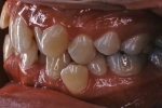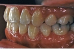 しかし、出題基準にも書いてあるように、このケースは欧米の白人によく見られるケースで、東洋人にはきわめて稀である。そこで類似ケースとして過蓋咬合(かがいこうごう)のケースを代替えとして認めるという配慮をしている。過蓋咬合とは非常に強く深く咬んでいる状態を言う。Overbiteとは前歯の垂直的な重なり具合を示す数値で、5mm以上だと上の前歯が下の前歯をほとんど覆い尽くしている感じになるので、前から見ると下の前歯はほとんど見えない状態になる。こういう状態が典型的な過蓋咬合である。典型的なclassⅡ,division 2のケースは過蓋咬合を合併している。